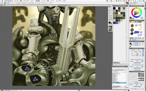 In order to emphasize the sense of distance, let the greenness of the robot's exteriors lower as their positions go background, and try to familiarize them with olive drab.