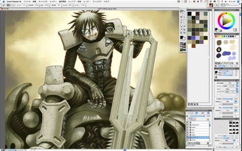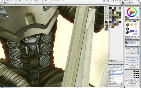 In order to express the backlight flare, create dark red and apply it to the place where Sechs' body is in contact with the background.