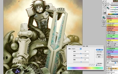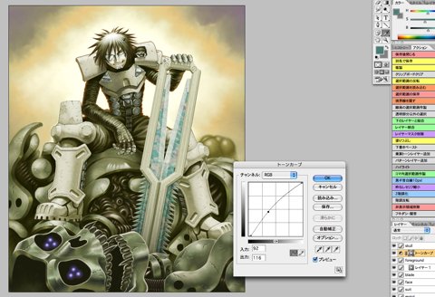 When I looked at the test print, I thought the tone of the whole background including Sechs, except the skull robot's head in the front, should be a little lighter, so adjusted the area by applying the adjustment layer on it.