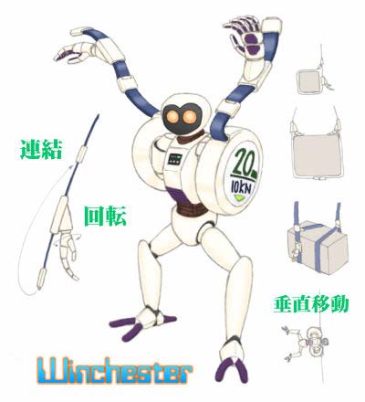 | 身長130cm テナガザル型ウインチロボット。 積み下ろしの臨時作業等に使われる。 腕は20mまで伸ばせる。短いときは自在に曲げられるが、 長く繰り出すときは硬化させる。 丈夫にできているがパワーは控えめで、 片腕で10kN(1tちょっと)まで巻き上げ可能。 大きく重いものは、チームを組んで作業する。 |