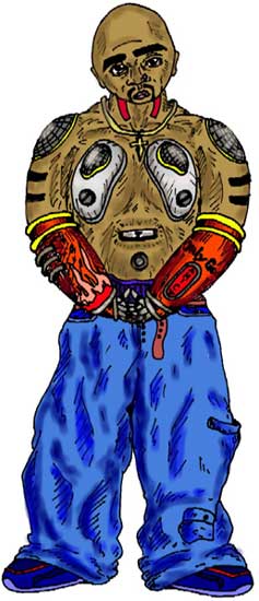 | クズ鉄町出身のラッパー。 クズ鉄町での悲惨な現実をリリックにし、電波にのせて世界を 変えなくてはならないと世界中にラップで訴えかけている。 時にはザレムの人々を狂ったように批判した ひどく暴力なラップを吐き出している。 それが災いして何者かに殺害されてしまうが、脳がかろうじて 生きていたためにサイボーグとして復活をはたす。 サイボーグになってからは体内に搭載された、ミキサーやターンテーブルを 使い、自ら自分に合ったビートを作り出すことが可能になった。 腹にから音楽ディスクを取り入れることができ、最高97枚ストック可能。 左腕にはマイク入れてある。 胸と両肩につけられたスピーカーによりたった一人でもライブ パフォーマンスができるようになった。 |