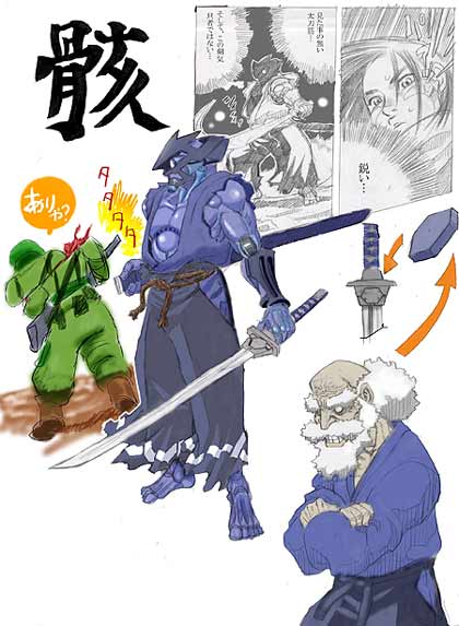 | 宇宙空手同様、剣術も宇宙時代を向かえ 新たな道を研ぎ澄ましていった。 厳九郎は熱心な刀匠だったが「刀の気持ちがわからん」と 行き詰まったが「自分が刀になれば…」という考えに たどり着き脳をチップに変え、肉体は刀の材料に混ぜてしまう。 そして脳チップを刀に内蔵、自分自身が刀に。 骸は名の通り、その刀を扱うだけのボディ。 (自律型ロボットでも面白いかも) 骸って名だからもっとスカスカホネホネのボディの方が 良かったと思うのですが、あまり良いのが浮かびませんでした。 |