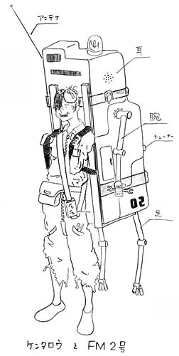ケンタロウについて ・何があったか知らないが、一部の分野では とにかく天才。現在27歳。 ・22歳の時にFM0号完成。しかし隣の家の子供に モンゴリアンチョップを決められ大破。 ・第3作目となる2号を完成させたのが27歳。 今の2号はできたてホヤホヤである。 FM2号について ・自分でも歩けるが、ケンタロウに背負ってもらった方が 楽なので足が不自由なフリをしている。 ・脳チップによる自我がある。 ・特技は時空間ラジオ放送。原理はケンタロウに訊かないと わからないが、とにかくチューナーを回せば時空を 移動したり、時間を止めたり、ゆっくりしたりできるらしい。 0号の時は時間を遅めた際、自分も遅まってしまい、 まったく意味がなかったらしいが、 2号は自分以外を操ることに成功した。 ・一応ケンタロウはDJである。 |