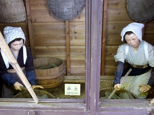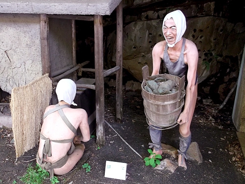 順路を進むと、まず人形による江戸期の採掘作業の再現シーンが現れる。ボタンを押すと電動で手が動いたり会話テープが流れたりして、当時の様子がわかるようになっている。当時はここで採れた銅の鉱石で銅貨(寛永通宝)が造られていたという。約400年も昔に発見された足尾銅山はピーク時には年間1200トンもの銅を産出し、この周辺は鉱山の町として非常に発展し、「足尾千軒」と呼ばれて栄えていたらしい。