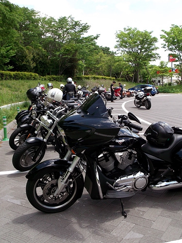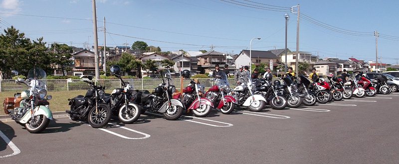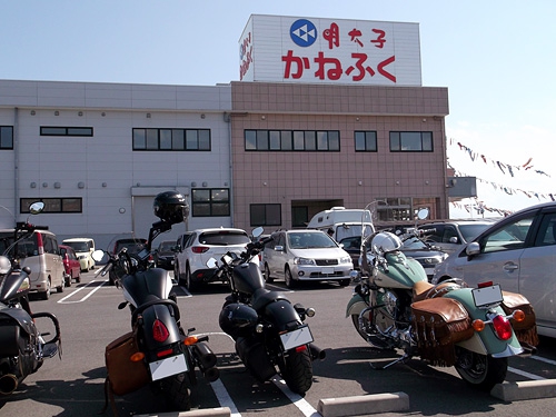 海鮮丼や刺し身定食などでそれぞれのメンバーが大洗の磯料理を堪能した後、10分ほど走って今回の目的地「めんたいパーク」に到着した。天気のいい休日なのでたくさんの観光客でにぎわっていたが、約20台ものハーレー、VICTORY、インディアンのビッグバイク集団襲来にみんな大注目。駐車場にズラリと並べて停めると圧巻そのもの。ここだけモーターショーのような雰囲気になっている。