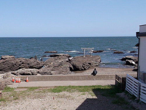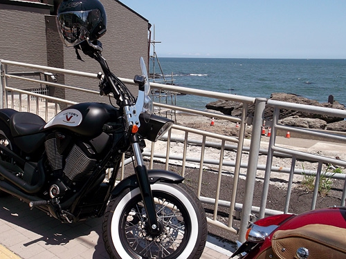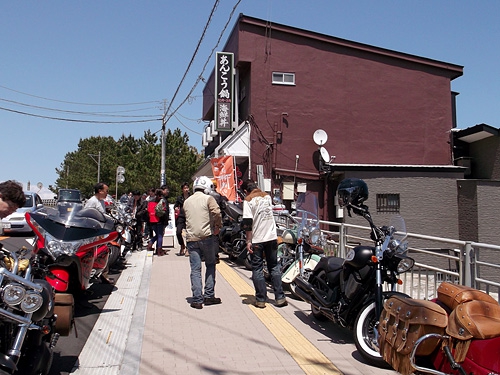北関東自動車道の終点・ひたち海浜公園ICで一般道に降りて、大洗の海岸線沿いを走っていく。初夏のような日差しと青い海がクルーザーバイクに実にベストマッチ。この日は日曜日だったので人もクルマも多かったのだが、渋滞で水を差されることもなく、約20台ものビッグバイクの隊列が順調に南下。大洗磯前神社前まで走り、第1目的地の食堂にて昼食となった。ところがバイクを停める場所がなく、なんとか歩道に並べて停めたものの、今度はツーリングメンバーが食堂に入り切れなくなり、10人ほどがとなりのホテルの食堂にて食べることとなった。