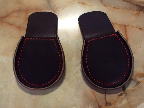 その要領でベロパーツを仕上げたら、側面パーツ内側の真ん中にゴム系接着剤を塗り、ベロパーツを張り合わせ、ヒシ目打ちで縫い穴を打ってナイロン糸で縫い合わせる。今回、糸は黒い革に映える赤色を、また擦れに強いナイロン製をチョイス。