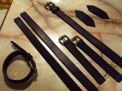 次に、2cm幅で切り出した各ベルトパーツの形を切り整え、黒く染めてコバと裏面を仕上げる。ついでにフタに付けるベルト止めパーツも新たに切り出し、コバを仕上げ、フタパーツと合わせて縫い穴を開けておく。