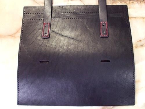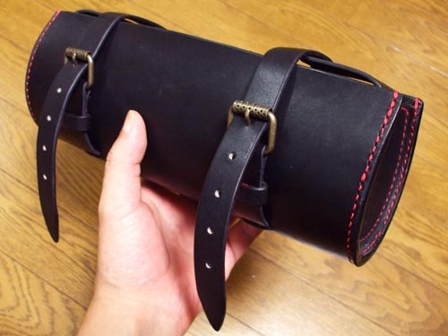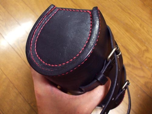ついでに製作途中、3.5mm革の本体パーツだけでは強度的に型くずれを起こす気がしてきて、底にさらにもう1枚、3.5mm革をカシメで固定してみた。二重底とすることでかなり強度が増し、これで型くずれの心配はなくなった。
