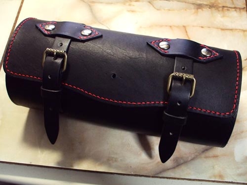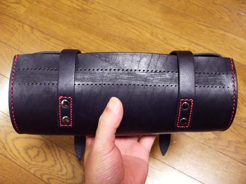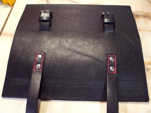 さてフタパーツにはベルトの位置に合わせ、ベルトを通すベルト止めを縫い付ける。さらに見た目と強度を考え、両側にカシメを打った。また強度とは関係ないが、フタのふちを縫い、赤いステッチでオシャレに仕上げてみた。