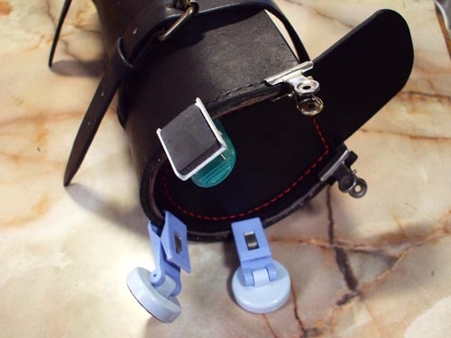 接着剤だけでもかなり強力にくっつくため、とりあえずフタパーツをかぶせてベルトを通し、仮組みしてみた。ついに完成時のツールバッグが姿を現した。本当にできるのかどうかハラハラしたが、大きさも手ごろでなかなか良い感じではないか。