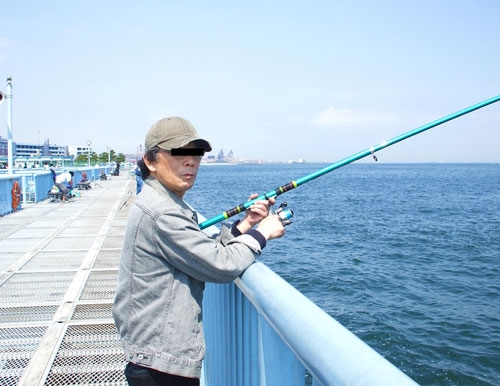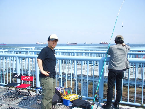「本牧海釣り公園」と同じく1人900円払って入場。平日にもかかわらず、やはり釣り客は数十人ほどはいるようだ。釣り場はベイブリッジを臨む「内側」と東京湾側の「外側」があるが、我々はまず人が少ない「外側」に陣を取る。さっそくエサをつけただけの「ぶっこみ釣り」で開始。しかし東京湾側から強い風が吹くせいか、頑張って竿をふってもなかなか遠くに飛ばない。