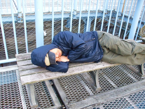 しかし釣れない。まったく釣れない。全然釣れない。昼ごろ海釣り施設に入って、3時すぎてもまだ釣れない。どうにも針が海底の岩場に引っかかりやすいので、場所をベイブリッジ側の「内側」に移動するものの、そこでも釣れない。まわりの釣り客を見てみても、やはりまったく釣れている様子がない。普通、まわりの人のクーラーボックスをのぞけば小魚の1匹や2匹は入っていて当然だが、それすらも見当たらない。「昨日雨ふったんだから釣れるはずなんですけどねぇー」とカッペさんも首をかしげるばかり。