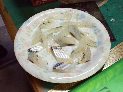 さっそくBプロダクションの仕事場で、サヨリの刺し身をいただくことにした。Tさんは「焼いてもいいんじゃない」と言うが、私には海釣り施設のおじさんの「刺し身が最高だよ!」という言葉が脳裏から離れなかったのである。釣った魚を刺し身で喰う。これぞ男のロマンではないか!……と言いつつ運転で疲れていた私は、魚を捌くのはカッペさんに任せて(←ひどい)ドキドキワクワクしつつ出来上がりを待つ。