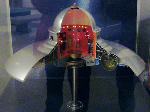 それぞれのUFO模型のケースの前には、押してくれと言わんばかりのスイッチがひとつ。アダムスキーの方をボチッと押してみると、ピカピカ電球が点滅しながら電子音が鳴り渡り、UFOが徐々に回転し始めた!UFOの反対側は1/4ほどカットされ、UFO内部の仕組みがわかるようになっていたのである。中には操縦している宇宙人もいて、実に芸が細かい。