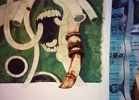 パイプの錆び部分を描いているところ。昔、工場などを回って撮影した資料が役に立っています。