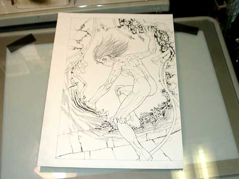 下書きにペン入れし、消しゴムをかけた状態。普段のモノクロ原稿と違う点は髪の毛の描き方と、顔などに斜線で影を入れないことぐらい。あとはほぼ普通にペンを入れる。