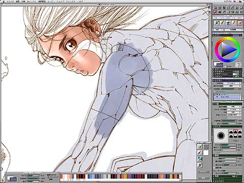 顔の下塗りはここまでとし、乾燥させる。いったん乾燥させてしまうと、その後に水彩ブラシで塗り重ねた色は混ざらず彩度が高くなってしまうため、慎重にならざるをえない。