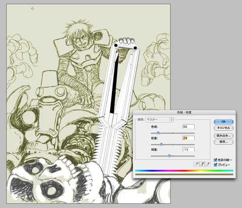 PhotoShopでファイルを開き直し、「イメージ」→「色調補正」→「色相・彩度」を選択。