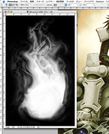 たった今戦闘があったばっかりの「出来立てほやほや感」を出すため、前景のロボ頭部と背景の間にスモークの効果を入れることにした。