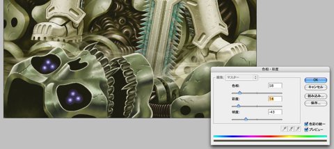 「色相・彩度」で「色彩の統一」にチェックを入れ、黄色っぽいガスにする。