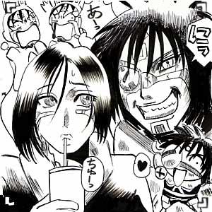 こちらは今回が万歳塾初登場、お絵かき万歳ではすでにおなじみの同人系お絵かき職人・沖縄の笑也塾生である。当万歳塾ではなぜか「漫画系」の塾生が意外と少ないが、そんな中、笑也塾生はバリバリの漫画風作品で参戦だ。銃夢LOの人気キャラそろい踏みのスナップショット作品だが、写真という設定にもかかわらずフキダシ描きまくりの擬音入れまくり。しかしこの同人ノリとモロ漫画原稿風のペン画は、当塾ではかえって新鮮で、元気さにあふれている。実に天晴れである。「塾長にお見せすると思うと手がガチガチに…」と言われてもこの作品を見る限り到底信じられないが、緊張してもこのノリを維持できるというのは大物の素質アリかも知れない。次は是非リラックスしてのびのびと描いた作品を期待したい。ただしタガを外しすぎないよう精進である。