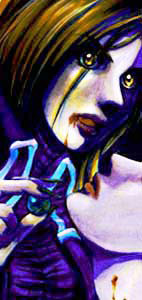 今回トリを務めるのは、前回上州赤城おろしと共に初登場した群馬の手練れ絵師・広末まきな塾生である。御仁の今回の新作は、これまた銃夢LOの人気キャラ、ヴァンパイア理事長・カエルラ様のお食事シーン。元がアナログ画だというのが影響しているのか、本の挿絵のような深みのある手書きタッチが印象的。紫と黄色という極端な配色ながら、黒ベタを使うことで見事にまとめ上げ、妖しい雰囲気作りに貢献している。細部の描写やタテ長のキャンバスを使った効果的な構図など、御仁の高度なテクニックが遺憾なく発揮されている。実に天晴れである。「暗くなってしまいました」とのことだが、この絵が明るくてもどんなものかと思うので、これはこれで良かろう。前回は漫画タッチで今回はシリアス路線、さて次はどんなものを見せてくれるのか、今から楽しみにしておこう。落ちている物は拾って食べないよう精進である。