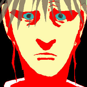 さて今回のトップバッターは、万歳塾を代表するお絵かき暴れん坊将軍・東京都のバーサーカー塾生である。最近はややおとなしく真面目な精進に徹しているようだが、油断するといつ暴れ出すかわからないので注意が必要である。して御仁の新作は、木城ゆきと作品の中でもマニアな人気を誇る「灰者」から、主人公のスネブ像。原作の雰囲気に合わせた原色ベタ塗り手法だが、緊張感を醸し出す黒バックに、影の鮮明なオレンジが力強く印象的。スネブの死魚のような眼差しがいっそう緊張感に拍車をかけている。実に天晴れである。コメントにある「この色が似合う」と言っているのが影のオレンジなのか背景の黒なのか、それとも青い白目なのかはわからないが、御仁の得意分野である色彩感覚を生かした作品であると言えよう。ところで画面右上、耳の上の背景塗り残しは後で塗っておくように。今日この頃も明日もあさっても精進である。