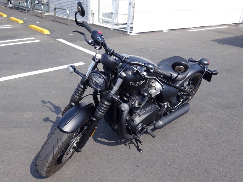 店員の方に現行車種についての説明などをしてもらい、さっそく外に出て試乗へ。試乗車は、プレミアムモデル「ボンネビルボバー」をさらにメーカーがカスタムした上位モデル「ボンネビルボバー・ブラック」。ボディカラーやエンジン、マフラーをブラックペイントした他、フロントホイール径を16インチにしてディスクブレーキをダブル化、LEDヘッドライトやクルーズコントロールなど豪華装備を標準で搭載する。