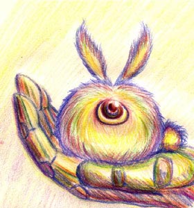 こちらも鎮痛剤塾生と同様、前回の第49回に万歳デビューを果たした福岡県の銀さん塾生、精進祭りにも堂々参戦である。お絵かき掲示板「お絵かき万歳」の常連でもあるこの御仁は、描くたびに違った絵柄を模索する芸術家肌だ。そして今回ついにその感性の一端を爆発させたと言ってもよいであろう、色鉛筆画キムジィの登場である。青い主線に黄色や赤を使った大胆な描写は、このシュールな小動物(?)を愛好する者の心象風景をかいま見るようだ。色鉛筆というだけでもかなりチャレンジな作品だが、この芸術的仕上がりはゴッホも裸足で逃げ出す迫力がある。そのチャレンジ精神は実に見事、実に天晴れである。ただしこれ以上芸術方面に突っ込まれても、塾長たるワシに芸術的素養がないので評論不能となる可能性がある。それでもなお突き進むか、あるいは違う方向を迷走するかは御仁次第。苦手なものでも精進である。