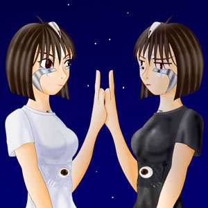 さてさて「天晴れ精進祭り」の「進コースTシャツ編」一番乗りは、すでに「祭コース」でも一番乗りを果たしている兵庫のそらやん塾生である。作品については本人がコメントで全てを語ってしまっているので説明の必要はないだろう。繊細な線画にきっちりとした彩色がこの御仁の持ち味だ。また生き生きとしたキャラクターの表情や、凝ったシチュエーション作りもこの御仁の特色といえよう。構図は完全なシンメトリー(対称)構図で、片方を描いて反転コピペ配置したのは明白なのだが、それはここだけの秘密にしておこう。ともあれ天晴れである。気になるのは腹部の謎の目玉模様(キムピーとキムポー?)と、二人の手が重なっていないのは反転コピペ配置でうまくいかなかったからではないかという疑惑である。しかし塾生と塾長の間に亀裂が入ってもアレなので、その疑惑はワシの胸にしまっておくことにしよう。明日を信じて精進である。