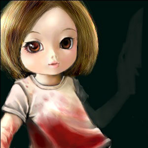 すでに精進祭り「祭コース」にて久方ぶりの「技能賞」を獲得した若きイラストマイスター・沖縄のまき塾生がこちらにも見参である。さて御仁の新作は…こ、怖ッ!チャ○ルドプレイか!? まさに○ューピー人形のごとき純真無垢な表情でTシャツをケチャップに染める(本人談)少女ガリィ。闇に溶ける左手のシルエットはあまりにも不穏な形をしている。ちょっとまて、こっち来るな!と思わず叫ばずにはいられない恐怖なシチュエーションが素晴らしい筆致で描かれている。この御仁の特徴と言えるガラスのような瞳、美しい金髪(?)、朱に染まったシャツの質感、少し楽しそうな表情とスキのない構図。その全てが見事、全てが天晴れである。がしかし。どうしてこんな子に育ってしまったのか。タイトルもコメントも全てが怖い。あまりにも怖いので、これまた久しぶりの「致命賞」進呈である。お願いだからクッキングよりも精進に励むように。