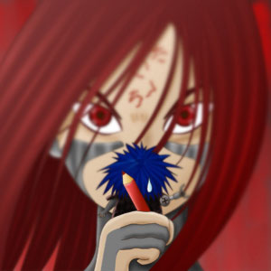今回「精進祭り」でめでたく万歳デビューを飾るのは、兵庫から参戦するそらやん塾生である。作品はガリィとゼクスの仲の良さを示す(?)微笑ましい一コマ。この後二人の周囲1kmは灰じんと帰すわけで、友情には多大なる犠牲がつきものという真理を無言のうちに示していると言える(ホントか?)。バックの怒り心頭ガリィを炎の赤系、手前のプチゼクスを冷や汗の青系にわける配色や、ガリィにボカシをかけて距離感を出す演出など、ストーリー性に加え技術的な部分も実に天晴れである。ガリィのひたいのラクガキは「たこくち」と書いてあるわけだが、もっと感覚的にわかりやすい「○」「×」といった古典的なラクガキでもよいかも知れない。ラクガキがバレても必死に精進である。