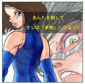 初参戦の似顔絵万歳・第45回から連続で精進を続ける燃える闘魂オエビニスト、埼玉のきづき塾生、精進祭りにもファイトで参戦である。作品は銃夢LO1巻のガリィとゼクスをオーバーラップさせた模写イラスト。ガリィが左右反転している以外は、原作の絵柄に忠実な仕上がりを見せている。しっかりした線の運びや彩色、陰影の表現に御仁の精進度が見て取れる。この絵ではオーバーラップしているゼクスの方が主役であり、「本物になる」というセリフは御仁自身の気概の表れとも言えるだろう。その気概は実に見事、実に天晴れである。ただしそのセリフがキャンバス右上に配置され、うるさくなってしまっている感がある。セリフ枠がガリィの顔にかかってしまっているのももったいない。セリフはこの場合、キャンバス左下が構図的に安定する位置だろう。泣いても笑っても精進は精進。精進する時はいつもひとり。この世にやまぬ雨はない。夜明けを信じて精進である。