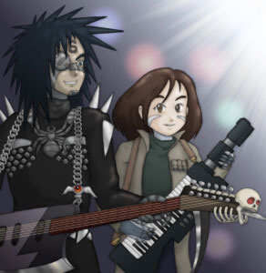 万歳塾始まって以来、これほどおなじみの塾生は前代未聞である。万歳塾生徒会長にしておやぢギャグマイスター、神奈川の美村塾生登場である。今回の精進祭りではすでに「精コース」に参戦しているが、何より万歳塾・第26回から連続投稿記録を現在も更新中。まさに万歳塾の名物塾生と言っても過言ではない。さて作品はヘヴィメタルックに身を包んだメタルゼクスと、ギター型キーボード・ガリィのライブ風景。いつもながら高次で安定した画力を見せる御仁だが、今回は人物二人、楽器が二本、ヘヴィメタルックと複雑極まりない構成ながら、リキむことなくサラリと描き切っている点は素晴らしい。実に天晴れである。ゼクスのトゲトゲドクロなメタルルックは思わず80年代メタルを彷彿とさせてしまうノスタルジックさだが、これは御仁がメタル素人とのことで仕方のないところ。またギター型キーボードを見ると鍵盤ハーモニカを想像してしまうのはワシだけと言うことにしておくので安心するように。最後が何だかよくわからんが精進である。
