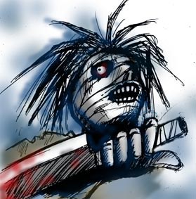 万歳塾の実力派中堅塾生として、当塾平均画力レベルの底上げに貢献している新潟のまふゆ塾生が今回も参戦である。作品は旧・銃夢でカルトな人気を誇るガリィの宿敵・ザパンの包帯ver。暑い夏はホラーで涼しく…というのは奇しくもせつやく塾生と同じ発想だが、まふゆ塾生のアプローチはより直接的なスプラッターホラーを目指している。今までの作品とは打ってかわって荒々しくダイナミックな主線、下からあおった動きのある構図など、非常にチャレンジフルな作品であると言えよう。その挑戦心は実に天晴れである。ただ意図的なのか水彩のようにボカシを効かせた着色で、刃物についた血痕も淡くタンパクな表現になってしまっている。ザパンの表情はなかなか良いのだが、あと一歩で凄惨な雰囲気にまでは届かなかったのが惜しいところ。ひょっとすると御仁はこういうホラー物が苦手なのかもしれないが、新機軸に挑戦する心意気は評価したい。夏は涼しくホラーに精進である。