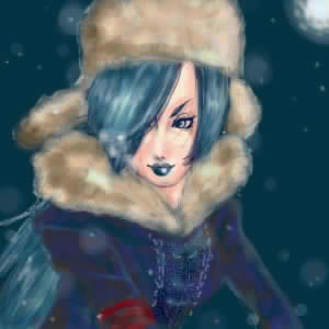 お絵かき掲示板「お絵かき万歳」の常連としてすでにおなじみ、埼玉のまる隊員が我が精進隊に本日めでたく入隊である。しかるに今作のカエルラ嬢バストアップ像もオエビ作品だ。コメントにあるように服装がコミックス8巻のものにやや似ているが、これは8巻発売前から描き始めたオリジナルのもの。雪の降る冬空を表現している深いターコイズ色が秀逸だ。また同色トーンで髪や唇も統一し、冬の女王たるカエルラ嬢の威厳に満ちた姿を描いている。実に天晴れである。さて、コメントにある「馬に乗って」という状況を想像してみると、なるほどこの姿勢は馬にまたがったものであることがわかる。しかし、言われなければ全くわからないのが痛い。せめて手綱とタテガミぐらいは入れて欲しかったところ。まあまだまだ御仁はこれから伸びていく人材であると思うので、明日の飛躍に期待したい。人生万事サイボーグが馬であっても精進である。