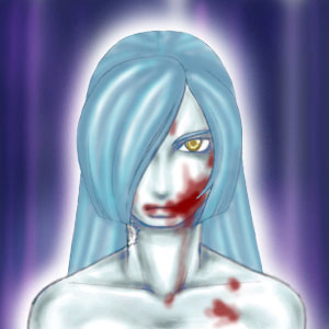 前回の第1回精進祭りが万歳デビューとなるこの御仁、もはやおなじみの美白背景雪国絵師・新潟のまふゆ隊員が今回も出撃である。作品は口の周りを血に染めた、女吸血鬼の本領発揮たるカエルラ理事長像。日頃から隊長のワシが「美白(背景)」などと言っていぢめてきたせいか、今回は白背景ではない紫系効果バックだ。青白い肌に青い髪と青系で全体をまとめ、血の赤と瞳の金色を際立たせる手法が効果的な仕上がり具合を見せている。実に天晴れと言えよう。ただ血染めの絵にしてはさほど凄惨な印象がないのは、御仁の穏やかな性格が反映してしまった結果かも知れない。ただもうひとつ、キャラクター目線で真っ正面という構図にも原因がある。もちろん意図的に正面構図にする場合はあるのだが、御仁の場合は漫然と描いている線が濃厚だ。絵の自力はあるのだから、後は構図がもたらす絵の効果を把握できれば鬼に金棒である。宿命には逆らってでも精進である。