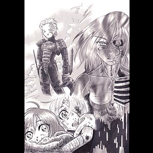 カエルラコースに続いて、精進隊が誇る霊媒系同人体質絵師・沖縄の笑也隊員が火星コースにも元気いっぱいに登場。ゴーストにさいなまれながらも微塵も深刻さを感じさせない南国人気質で、火星時代のエーリカと陽子、ゲルダ、そして現在のガリィをオーバーラップさせた大作を仕上げてきた。原作の絵に沿いながらも、御仁のタッチを活かして生き生きとした表情に仕上げているのが印象的だ。またター○ネーターばりに骨格を露わにしたガリィを重ねる手法は、いかにも同人作家らしい漫画的手法で手慣れている。実に天晴れと言えよう。ただ、おそらく漫画原稿用紙サイズで描いたであろうこの作品では、小さく縮小しすぎて迫力が半減してしまっているのが惜しまれる。ともあれ御仁のその元気があれば、幽霊の2〜3匹に取り憑かれても精進できるに違いない。楽しく元気に精進である。